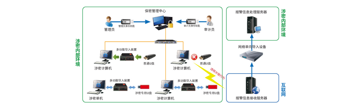 涉密计算机及移动存储介质保密管理系统依据国家相关技术规范标准进行研发,实现了阻断计算机违规外联、防止移动存储介质交叉使用、外部信息单向导入这三方面的功能,能够切实解决和防范计算机违规连接互联网和移动存储介质交叉使用引起的安全保密问题。